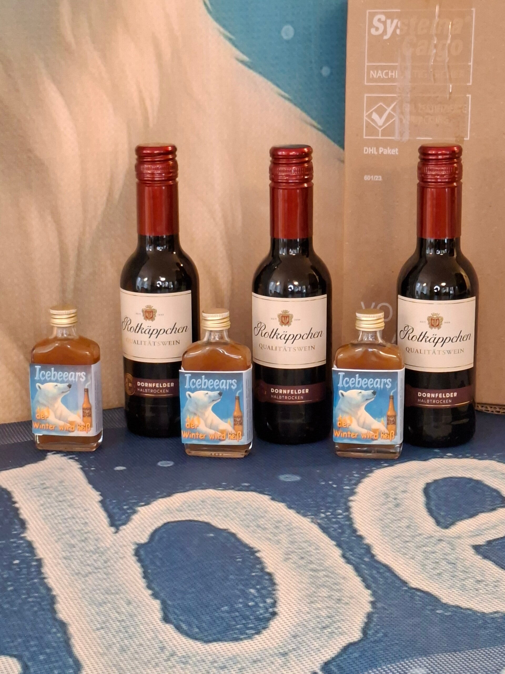 Paket mit 3 x Wein Flaschen 0,25l und 3 x Icebeears.